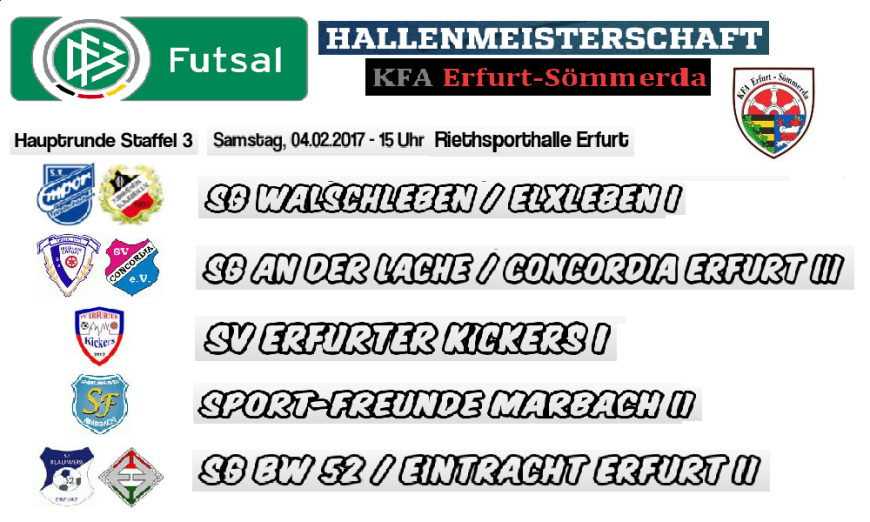 Es geht wieder auf's Parkett! Am Samstag steigt die 1. Mannschaft der Spielgemeinschaft in die Futsal-Hallenmeisterschaften ein. In einer Fünfer-Staffel will man sich für die Endrunde qualifizieren. Mit in der Gruppe werden ausschließlich unterklassige Mannschaften sein: An der Lache/Concordia Erfurt III (2. Kreisklasse), SV Erfurter Kickers (Kreisliga), Sport-Freunde Marbach II (1. Kreisklasse)und die SG BW 52/Eintracht Erfurt II (Kreisliga). Diese sollten allerdings keineswegs unterschätzt werden, denn nicht nur der Pokal, sondern auch die Halle hat ihre eigenen Gesetze! Weiter kommen die Tabellenersten der drei Staffeln sowie die zwei besten Zweitplatzierten, die dann am 12.02. in der großen Hallen-Endrunde mitmischen dürfen. Anpfiff ist um 15 Uhr in der Erfurter Riethhalle. Gegen 17:30 Uhr dürfte dann die letzte Paarung gespielt sein.